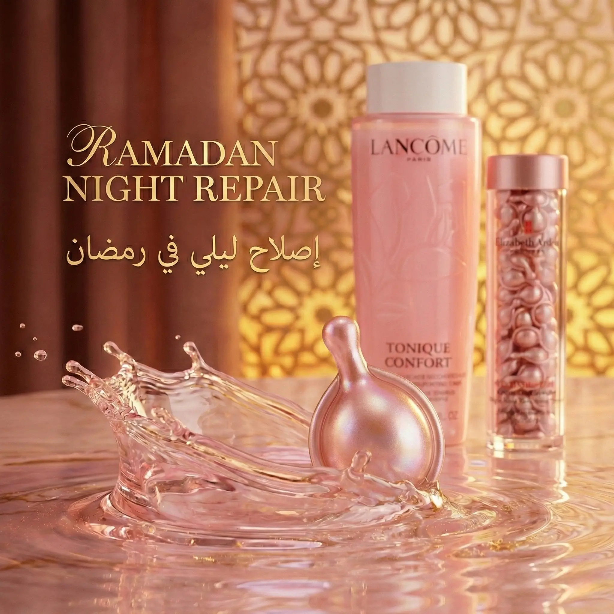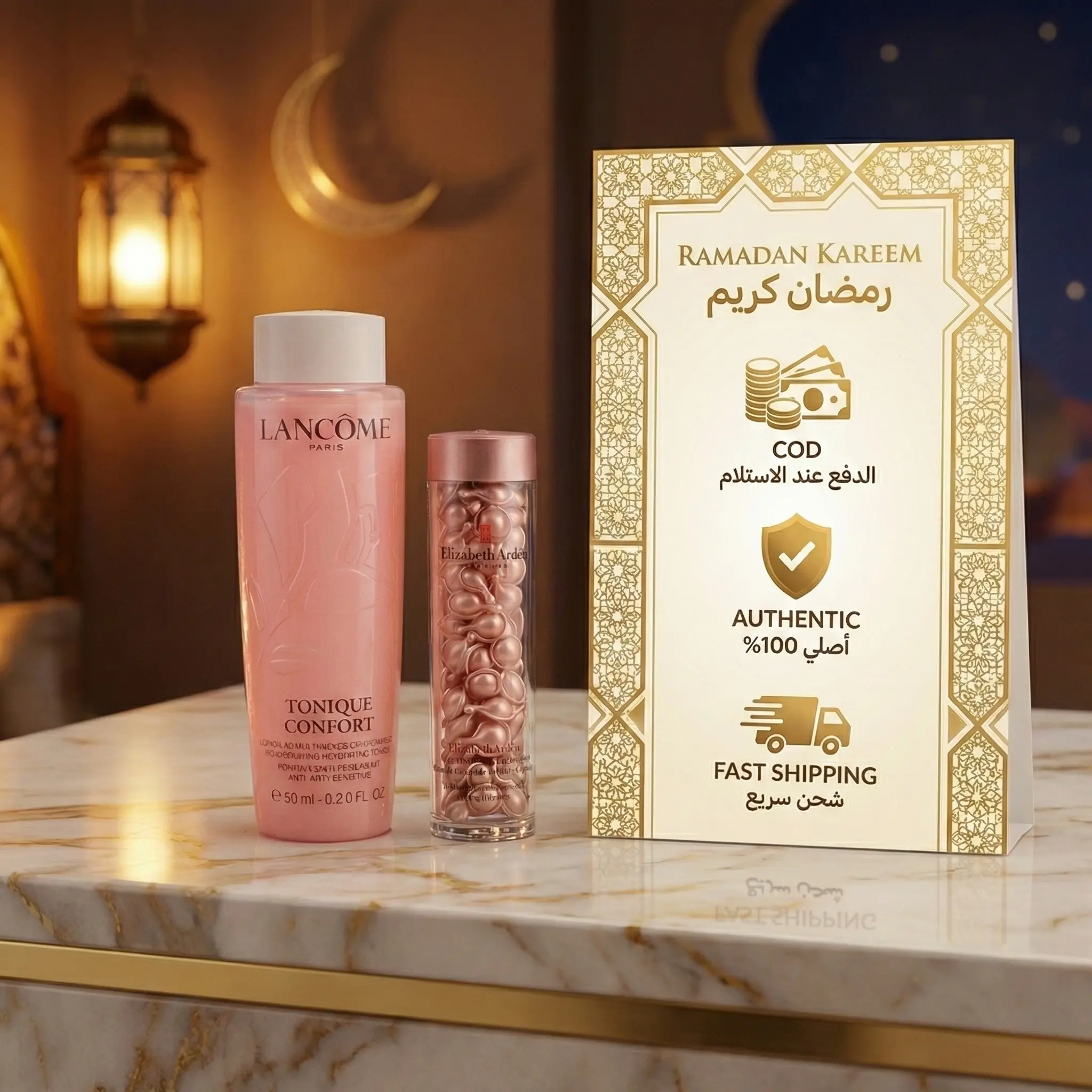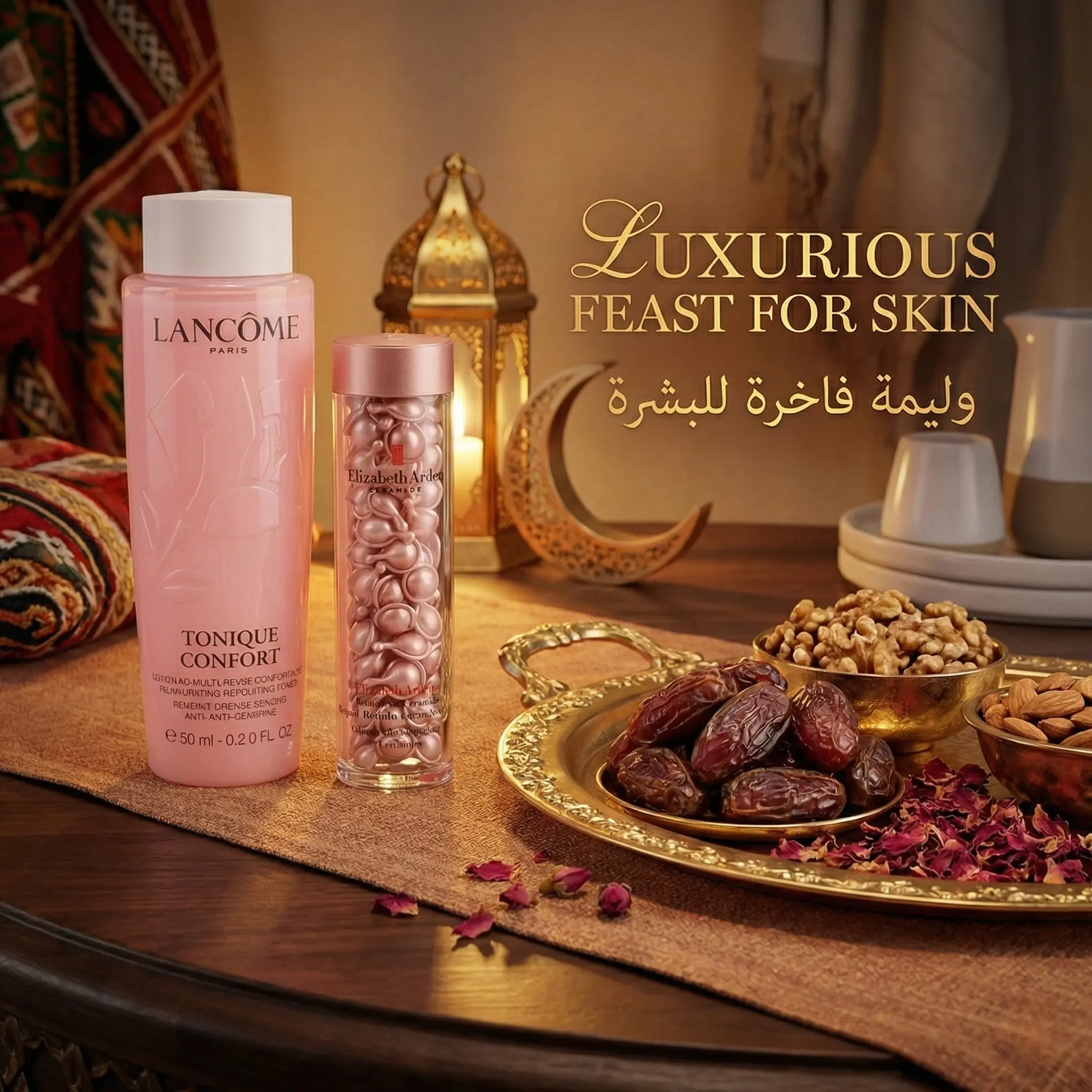 🌙夜间修护精华(伊丽莎白雅顿视黄醇胶囊 – 90粒):睡前使用,对抗斋月期间熬夜造成的“疲惫妆容”。它能在您休息时平滑肌肤纹理,细致毛孔。